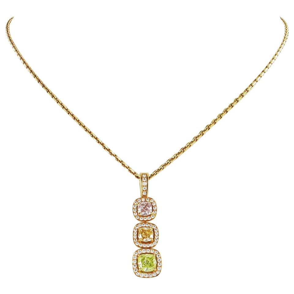 Beautiful necklace in red gold 18 karat manufactured by famous Swiss Jeweler Gübelin. All three fancy colored diamonds are GIA certified and of natural color. Cushion 0.31 ct (fancy light purplish pink - vs1), Cushion 0.31 ct (fancy yellow orange - si1), Cushion 0.56 ct (fancy yellow green- si1). Further set with 61 brilliant-cut diamonds totaling 0.30 ct. Superb workmanship!