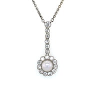 This charming Belle Époque pendant necklace features a white natural half pearl of 6.6 mm in diameter, set in 11 delicate prongs and surrounded by 11 Old European cut diamonds of H/I colour and si claritiy. This beautiful pearl and diamond flower is suspended from a fine, graduated diamond line, consisting of 6 Old European cut diamonds of matching colour and clarity. Total diamond weight approximately 1.16 carats.