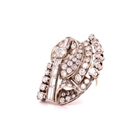 Designed as an artistic motive with curved and straight elements. The clip is given a Snail shell look by it’s grain and prong set spiral components. At the peak of the shell sits a 0.72 ct old European-cut diamond of I/J-si1 quality. The pattern is disrupted by two straight lines one set with baguette-cut, the other one with brilliant-cut diamonds.