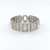 This bracelet is an Art Deco dream come true. Of geometric open work design, set with marquise and old European-cut diamonds. Millegrain-set with three old Euorpean-cut diamonds totalling 4.35 ct of I/J-vs quality and two marquise-cut diamonds totalling 1.70 ct of H/I-vs quality. Accented with 421 old cut diamonds totalling approximate 8.00 ct.