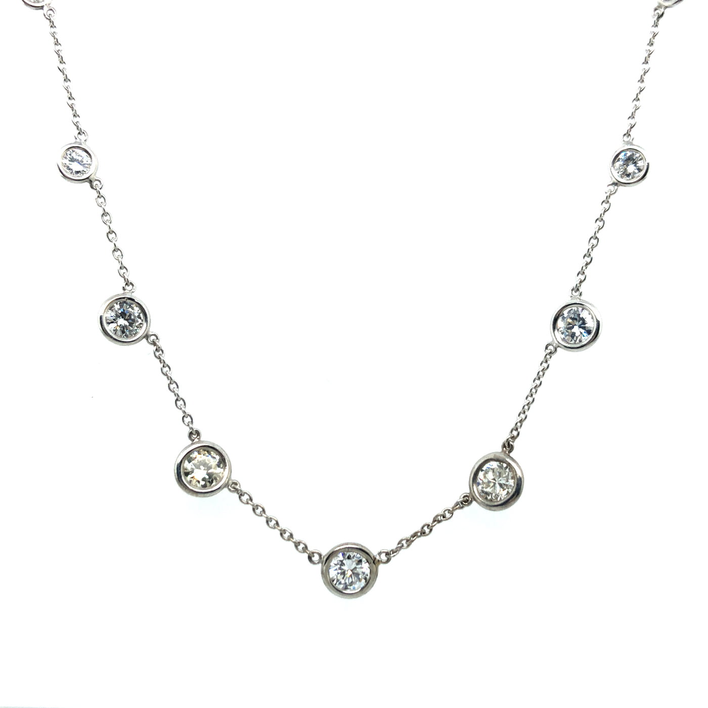 Delicate diamond necklace crafted in white gold 18 karat. Fine anchor chain interrupted by 9 brilliant-cut diamonds totalling 2.75 ct of G/8H/I colour and vs clarity. The bezel set diamonds range from 0.10 ct to 0.48 ct in individual weights. Chain secured by a lobster clasp in white gold.