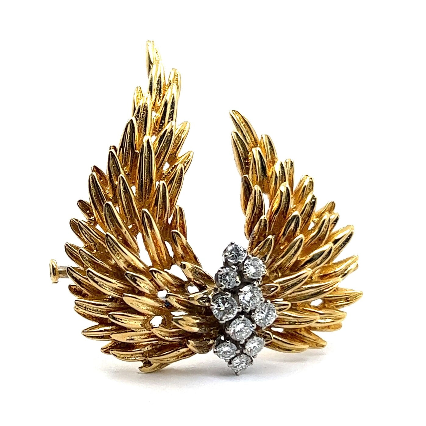 These golden wings are a beautiful embodiment of this symbolism. The willful frame of the 18K gold feathers creates a graceful curve, showing attention to every detail. It contrasts perfectly with the splash of 10 brilliants diamonds of G-H and vs clarity in the center of the piece. The total weight of the diamonds is 0.70 carats, while the piece itself has a weight of approximately 19 grams.